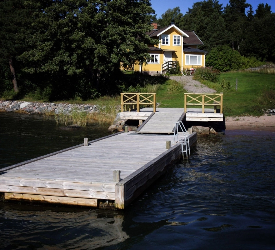 För grunda vikar, eller platser där man helt enkelt vill ha en mindre och inbjudande badbrygga, är en ren flytbrygga i trä ett prisvärt och smidigt alternativ. Den byggs med tryckimpregnerat virke och utrustas med flytkroppar i plast eller cellplast som ger mycket god bärighet. Våra träflytbryggor är lätta att montera, flytta och anpassa efter strandens form.