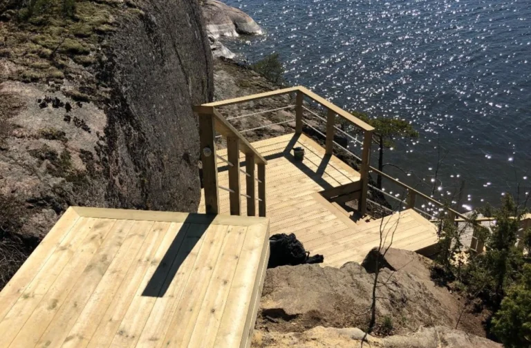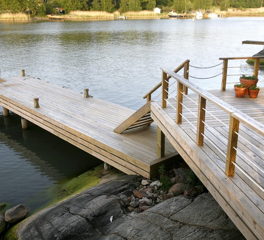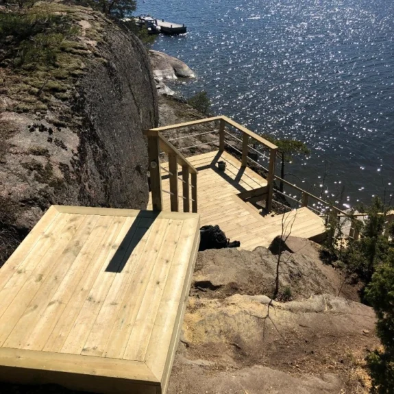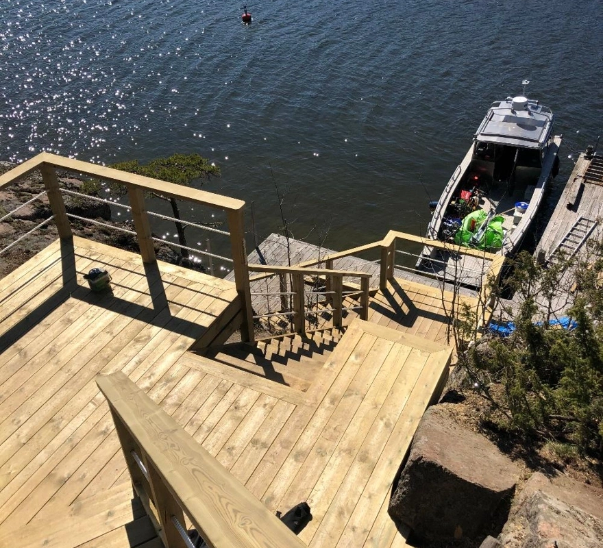Efter en röjning eller trädfällning väljer många att maximera sin tomt genom att bygga en härlig altan för att ta tillvara på den nya utsikten. Våra erfarna snickare bygger platsbyggda trädäck, trappor ner mot vattnet och skräddarsydda båthus av högsta kvalitet. Vi utformar alla snickeriarbeten noga efter din tomts unika lutning och förutsättningar. Eftersom vi arbetar med högkvalitativt och tryckimpregnerat virke, säkerställer vi att din nya uteplats eller marina konstruktion klarar fukt och väderpåverkan året runt.
